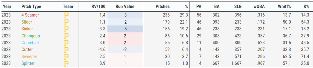 Peguero has kept the same approach to the plate throughout his career, which makes sense because it has made him successful through most of the minors. His raw tools and aggressive approach at the plate let him dominate his less talented opponents in pro baseball. The problem hit when he reached the majors and the competition is too good to have these flaws in his game. When Peguero did make contact with the baseball, his lack of barrel and swing control cost him. As the report said, he often tops the ball so instead of hitting a hard line drive it was often a hard ground ball to an infielder. He ran a 52% ground ball rate during his stint in the majors, which cuts into the raw power he has on display. His aggressiveness also needs to be utilized better, because swinging at pitches and spoiling them off is a valid strategy many hitters use. Unfortunately for Peggy, his aggressiveness is preventing him from making quality contact consistently. He barreled the ball a meager 5.2% of the time and hit the sweet spot of the ball only 27% of the time in 2023, both of which would rank around the bottom 3rd of qualified hitters in the sport. This is why we see the decrease of 13 home runs and an OPS in the 800s from minor league ball to sub 700 OPS and 7 home runs in the majors.