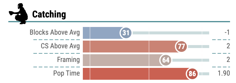 Just as it appeared his career was unraveling, Sanchez found success in San Diego. He produced strong offensive numbers, posting a 111 wRC+ and .780 OPS. In just 75 games, he hit 19 HRs. For reference, his wRC+ and HRs both ranked 11th in MLB among catchers with at least 250 plate appearances. Sanchez is a pull-hitter with high exit velocities, allowing him to consistently produce power for any lineup.