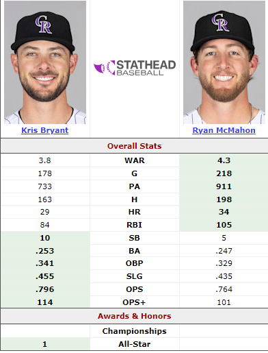 In 2021, the Giants acquired Kris Bryant in a trade with the Cubs for Alexander Canario and Caleb Kilian, their then 9th and 30th best prospects. Bryant was having a very similar year and a half before being dealt when compared to McMahon.